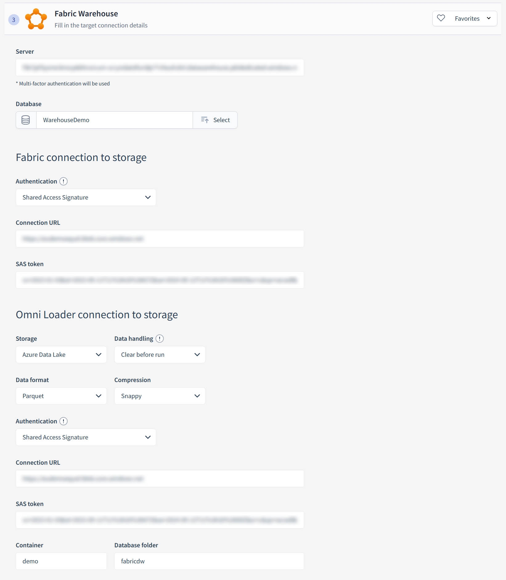 Data is loaded into the warehouse by uploading data files (Parquet or CSV) and triggering the ingestion by the warehouse. This means that both Omni Loader and Fabric Warehouse need access to the storage. As Omni Loader can run both on premises and the cloud, while Fabric Warehouse is cloud-only, you might have to configure their access differently.