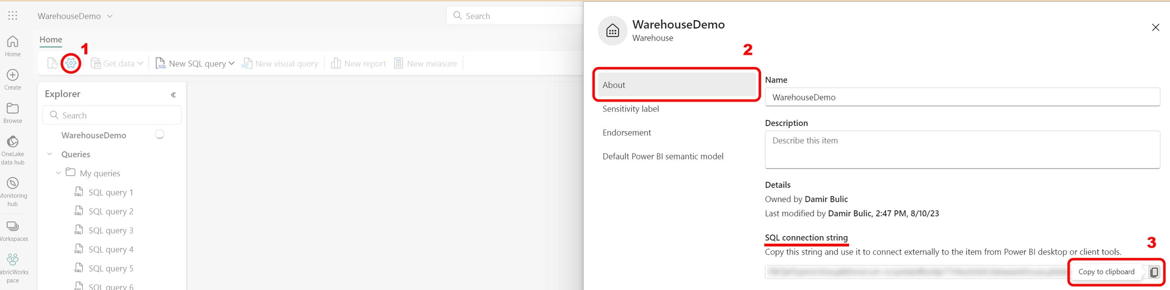 Server is the SQL connection string of your warehouse. To get to it, please open your lakehouse, click the Settings gear icon in the top-left corner, then navigate to the About section and copy the link.
