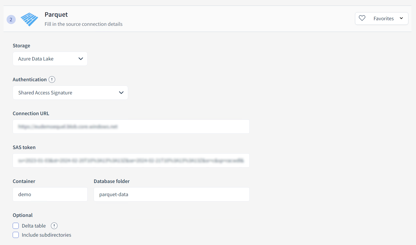 Local Selecting local storage implies that the Parquet files are stored on a local drive or network attached storage that is directly accessible to the system on which the connection is being configured. This might be the preferred option for smaller datasets or when operating within a secure and fast local network.