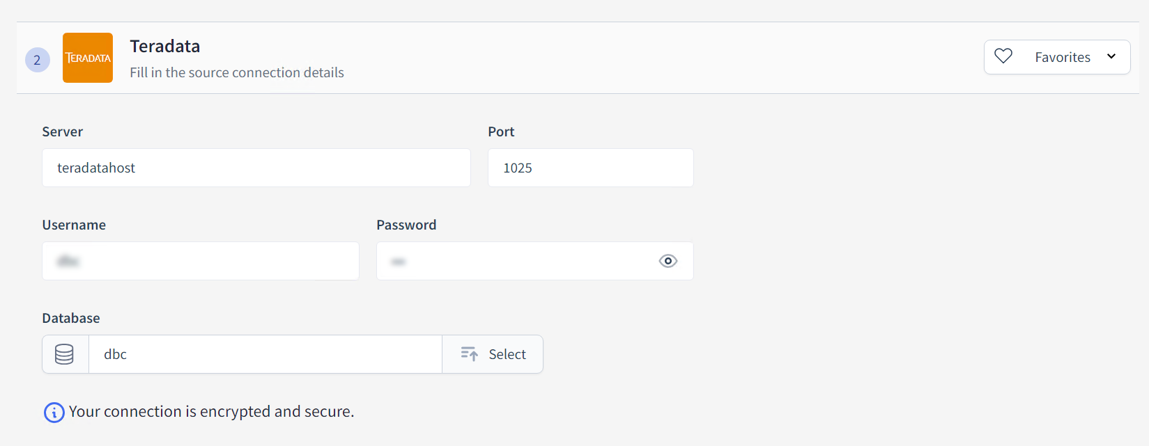 Enter the username that will be used to log in to the Teradata database. The example shows the default Teradata username dbc, but you should use a specific username provided for your connection.
