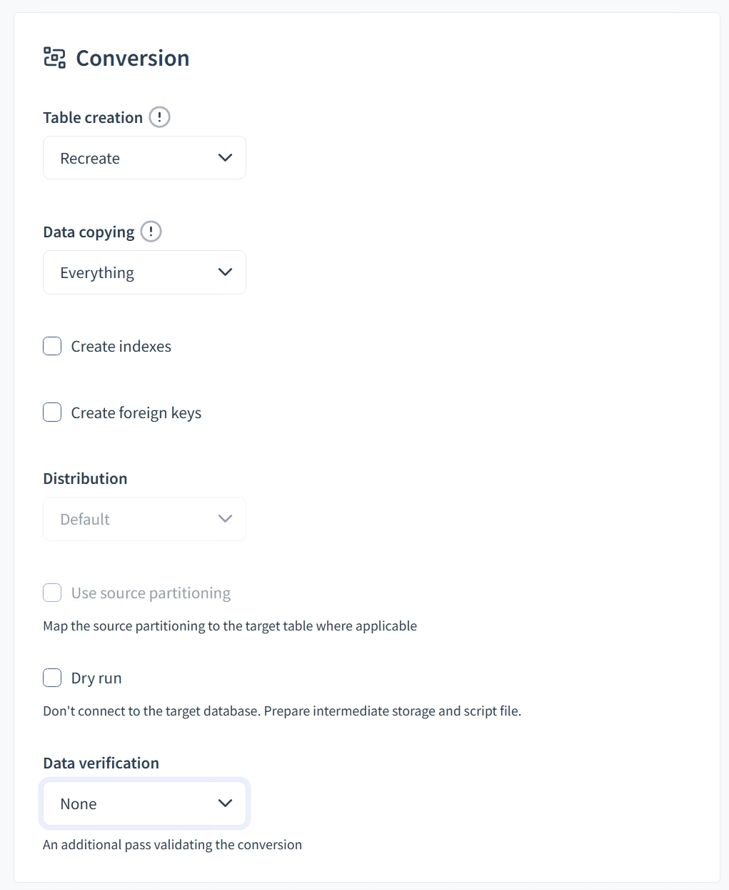 By default, Omni Loader will copy all of the data. To skip data copying (for example, if you only wish to create the target schema), select None.