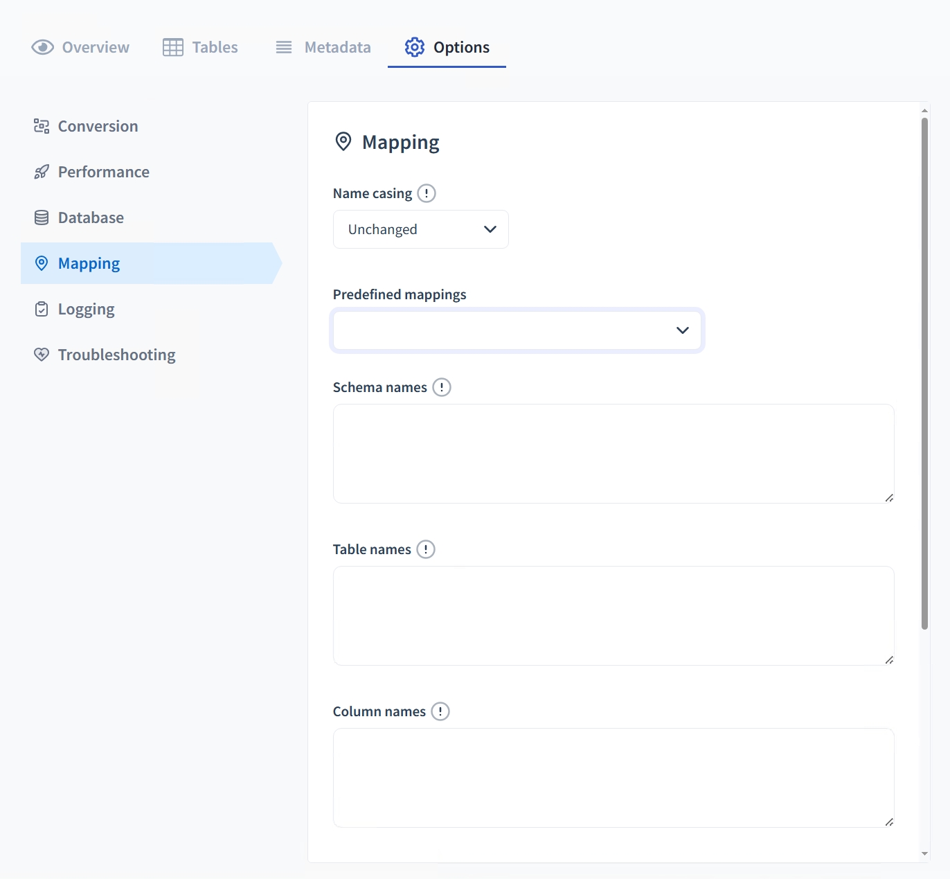 Note: The mapping below is applied to all tables. You can override the mapping for specific table by going to the Tables screen and opening the table details screen via the Details button next to the table name.