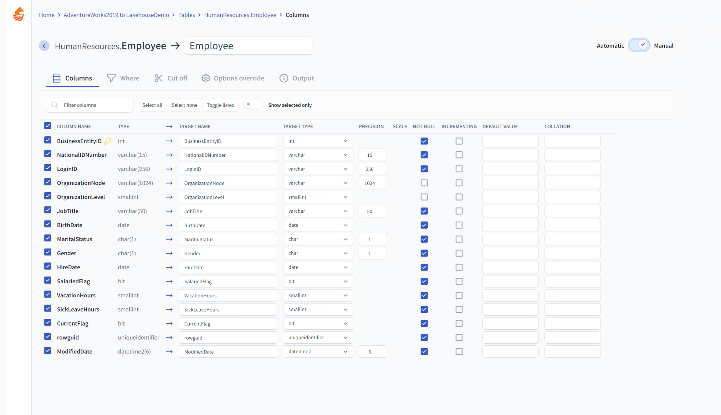 Primary Key This option maintains the primary key as the indexing strategy for the target table. It's essential for enforcing uniqueness and optimizing performance for data retrieval operations.